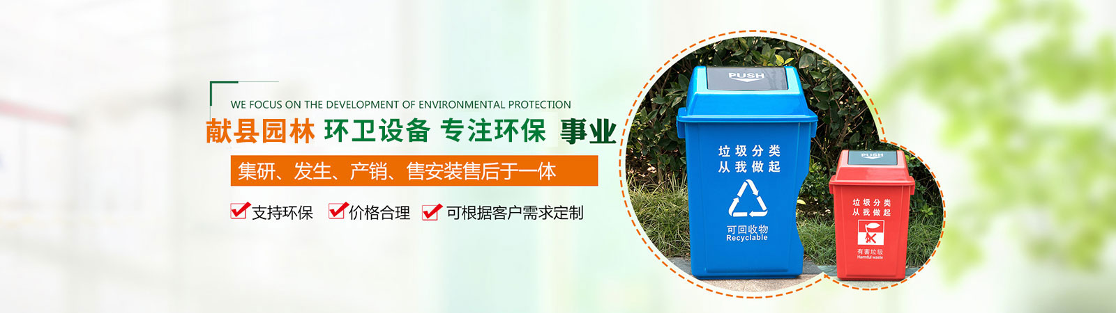 產品有:果皮箱、垃圾箱、花盆、護花欄、路椅、大型袋裝垃圾箱、保潔專用三輪車及環藝雕塑、健身器材及物業小區配套設施等。